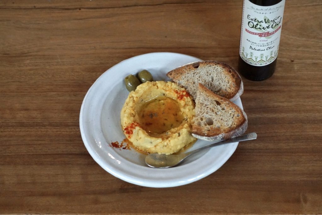 手間暇かけて日本に届けられたパレスチナのエクストラヴァージンオリーブオイルを、見て・香って・味わうフムス。