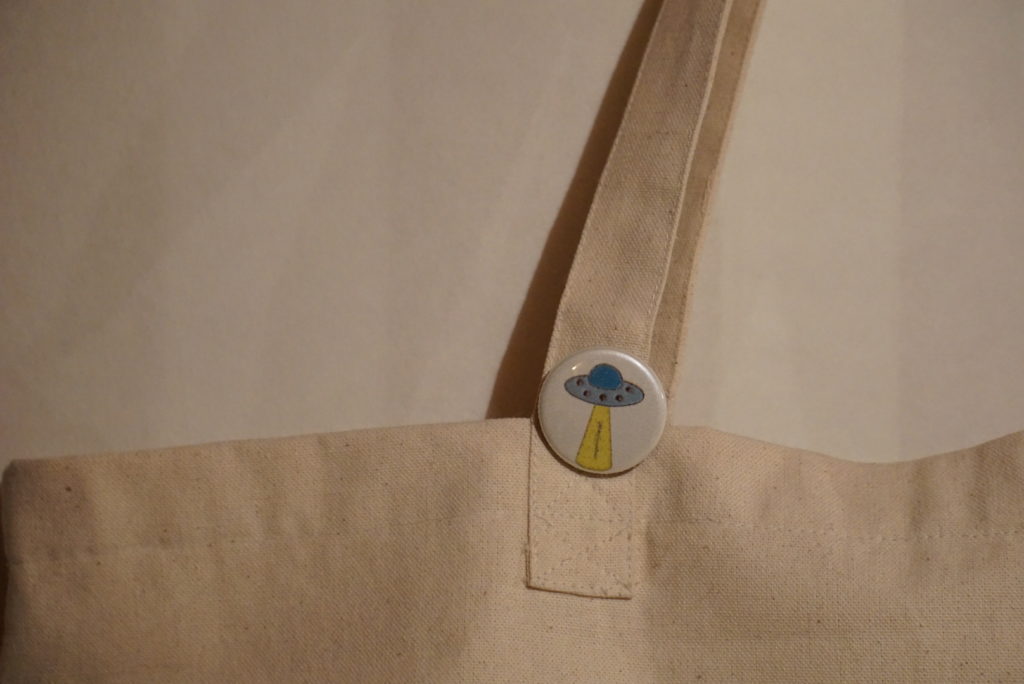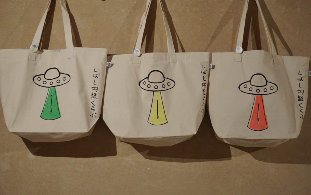 シサム工房さんの「キャンバスバッグ」を使用した「しばし円盤くらぶ」のレコードバッグ。3色展開&「しばし円盤くらぶ」のバッジ付!🛸